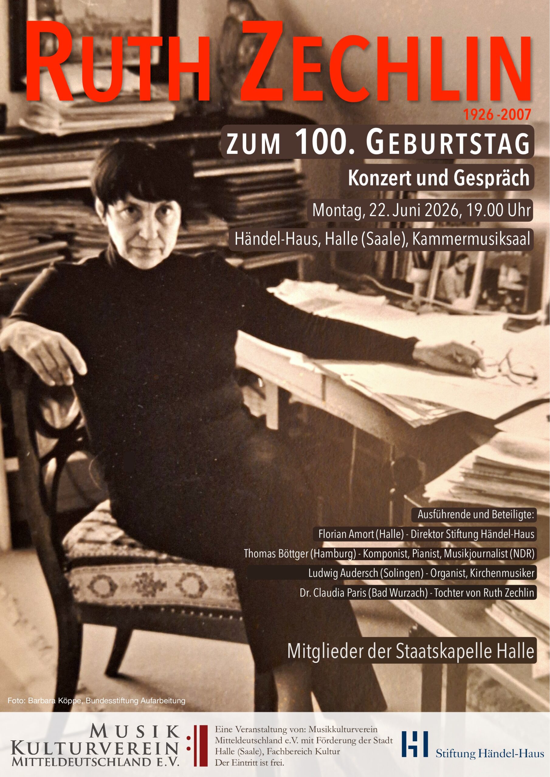 Termin: Montag, 22. Juni 2026 (Geburtstag von Ruth Zechlin), 19 Uhr Ort: Kammermusiksaal im Händel-Haus in Halle (Saale)